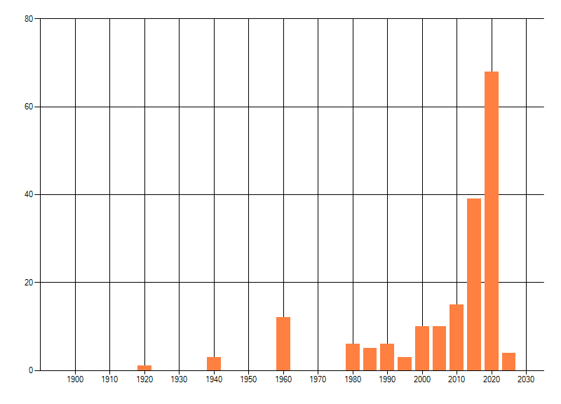 Het aantal atlasblokken (5x5 km) waarin de soort is gemeld binnen een periode van vijf jaar (vanaf 1980) of twintig jaar. Niet gecorrigeerd voor waarnemersinspanning en het aantal doorgegeven waarnemingen kan sterk variëren per periode, dus een trend in verspreiding kan hier niet direct uit worden afgelezen. Het opgegeven jaartal is het eerste jaar van de periode. Bron: gevalideerde waarnemingen uit de NDFF.