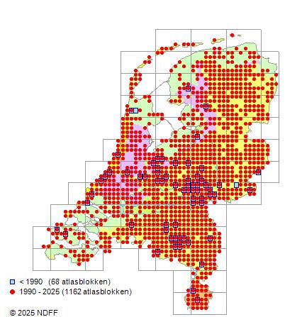 Het aantal atlasblokken (5x5 km) waarin de soort is gemeld binnen een periode van vijf jaar (vanaf 1980) of twintig jaar. Niet gecorrigeerd voor waarnemersinspanning en het aantal doorgegeven waarnemingen kan sterk variëren per periode, dus een trend in verspreiding kan hier niet direct uit worden afgelezen. Het opgegeven jaartal is het eerste jaar van de periode. Bron: gevalideerde waarnemingen uit de NDFF.