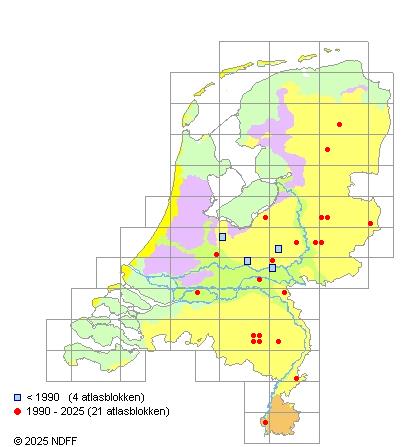 Het aantal atlasblokken (5x5 km) waarin de soort is gemeld binnen een periode van vijf jaar (vanaf 1980) of twintig jaar. Niet gecorrigeerd voor waarnemersinspanning en het aantal doorgegeven waarnemingen kan sterk variëren per periode, dus een trend in verspreiding kan hier niet direct uit worden afgelezen. Het opgegeven jaartal is het eerste jaar van de periode. Bron: gevalideerde waarnemingen uit de NDFF.