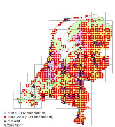 Het aantal atlasblokken (5x5 km) waarin de soort is gemeld binnen een periode van vijf jaar (vanaf 1980) of twintig jaar. Niet gecorrigeerd voor waarnemersinspanning en het aantal doorgegeven waarnemingen kan sterk variëren per periode, dus een trend in verspreiding kan hier niet direct uit worden afgelezen. Het opgegeven jaartal is het eerste jaar van de periode. Bron: gevalideerde waarnemingen uit de NDFF.