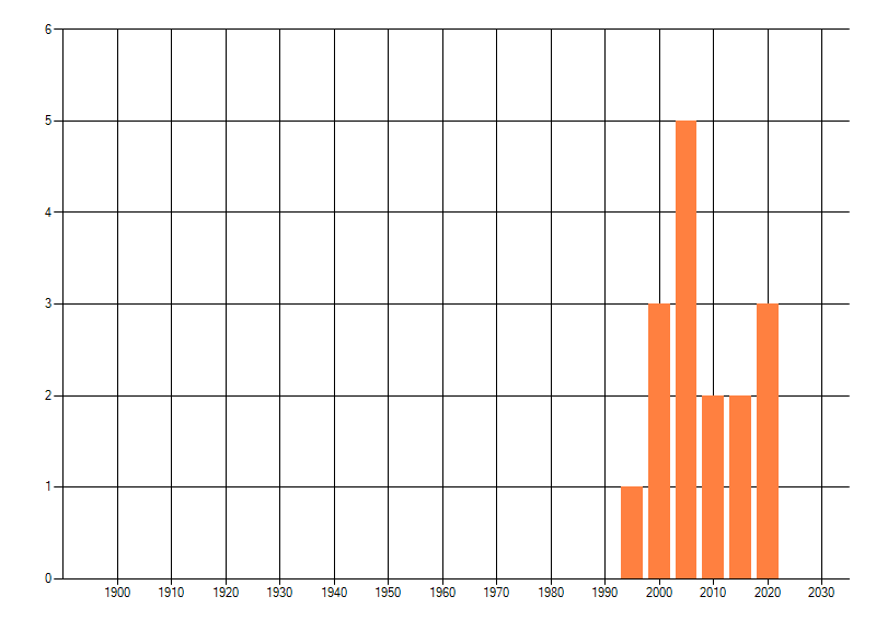 Het aantal atlasblokken (5x5 km) waarin de soort is gemeld binnen een periode van vijf jaar (vanaf 1980) of twintig jaar. Niet gecorrigeerd voor waarnemersinspanning en het aantal doorgegeven waarnemingen kan sterk variëren per periode, dus een trend in verspreiding kan hier niet direct uit worden afgelezen. Het opgegeven jaartal is het eerste jaar van de periode. Bron: gevalideerde waarnemingen uit de NDFF.