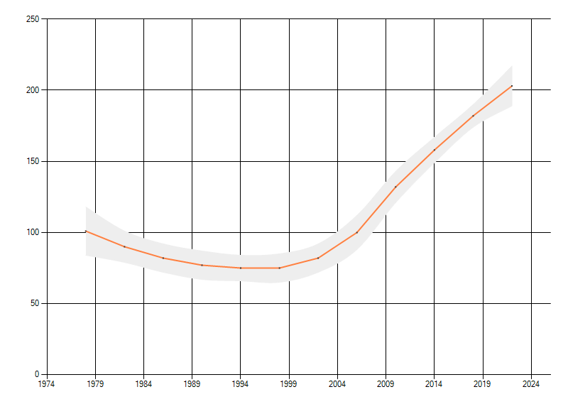 Gemiddelde trend van het aantal kilometerhokken waarin de soort voorkomt, weergegeven als indexcijfer (1975-1978 = 100).