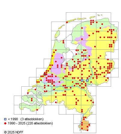 Het aantal atlasblokken (5x5 km) waarin de soort is gemeld binnen een periode van vijf jaar (vanaf 1980) of twintig jaar. Niet gecorrigeerd voor waarnemersinspanning en het aantal doorgegeven waarnemingen kan sterk variëren per periode, dus een trend in verspreiding kan hier niet direct uit worden afgelezen. Het opgegeven jaartal is het eerste jaar van de periode. Bron: gevalideerde waarnemingen uit de NDFF.