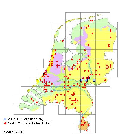 Het aantal atlasblokken (5x5 km) waarin de soort is gemeld binnen een periode van vijf jaar (vanaf 1980) of twintig jaar. Niet gecorrigeerd voor waarnemersinspanning en het aantal doorgegeven waarnemingen kan sterk variëren per periode, dus een trend in verspreiding kan hier niet direct uit worden afgelezen. Het opgegeven jaartal is het eerste jaar van de periode. Bron: gevalideerde waarnemingen uit de NDFF.
