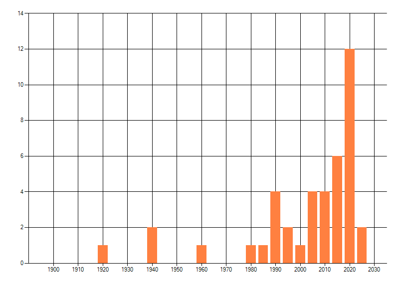 Het aantal atlasblokken (5x5 km) waarin de soort is gemeld binnen een periode van vijf jaar (vanaf 1980) of twintig jaar. Niet gecorrigeerd voor waarnemersinspanning en het aantal doorgegeven waarnemingen kan sterk variëren per periode, dus een trend in verspreiding kan hier niet direct uit worden afgelezen. Het opgegeven jaartal is het eerste jaar van de periode. Bron: gevalideerde waarnemingen uit de NDFF.