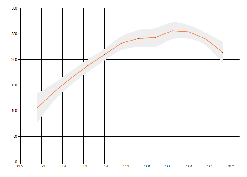 Gemiddelde trend van het aantal kilometerhokken waarin de soort voorkomt, weergegeven als indexcijfer (1975-1978 = 100).