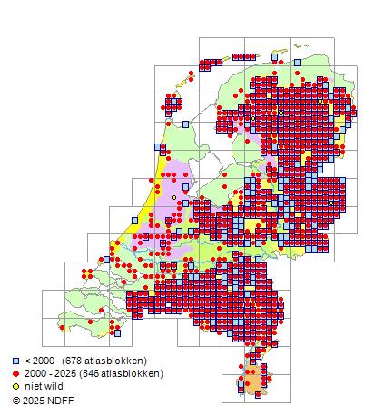 CC BY-NC-SA 3.0 NLVerspreidingNederlandVrij algemeen in het oosten en midden van het land en zeldzaam op de Waddeneilanden, in de duinen, in het rivierengebied en in Zuid-Limburg. Elders zeer zeldzaam.