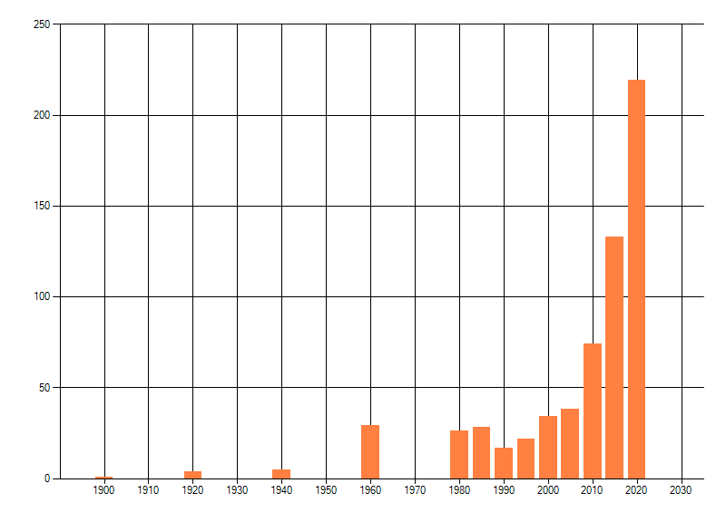 Het aantal atlasblokken (5x5 km) waarin de soort is gemeld binnen een periode van vijf jaar (vanaf 1980) of twintig jaar. Niet gecorrigeerd voor waarnemersinspanning en het aantal doorgegeven waarnemingen kan sterk variëren per periode, dus een trend in verspreiding kan hier niet direct uit worden afgelezen. Het opgegeven jaartal is het eerste jaar van de periode. Bron: gevalideerde waarnemingen uit de NDFF.