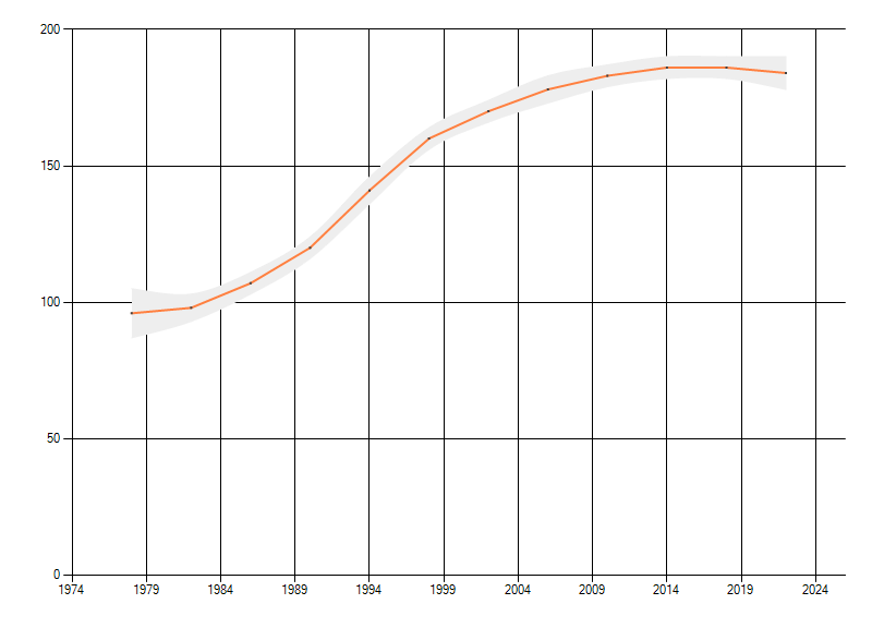 Gemiddelde trend van het aantal kilometerhokken waarin de soort voorkomt, weergegeven als indexcijfer (1975-1978 = 100).