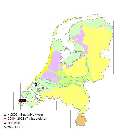 Het aantal atlasblokken (5x5 km) waarin de soort is gemeld binnen een periode van vijf jaar (vanaf 1980) of twintig jaar. Niet gecorrigeerd voor waarnemersinspanning en het aantal doorgegeven waarnemingen kan sterk variëren per periode, dus een trend in verspreiding kan hier niet direct uit worden afgelezen. Het opgegeven jaartal is het eerste jaar van de periode. Bron: gevalideerde waarnemingen uit de NDFF.