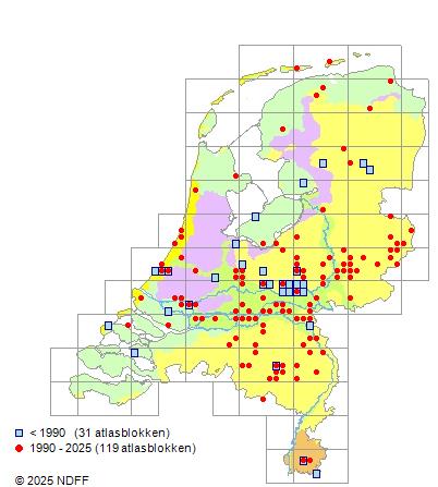 Het aantal atlasblokken (5x5 km) waarin de soort is gemeld binnen een periode van vijf jaar (vanaf 1980) of twintig jaar. Niet gecorrigeerd voor waarnemersinspanning en het aantal doorgegeven waarnemingen kan sterk variëren per periode, dus een trend in verspreiding kan hier niet direct uit worden afgelezen. Het opgegeven jaartal is het eerste jaar van de periode. Bron: gevalideerde waarnemingen uit de NDFF.