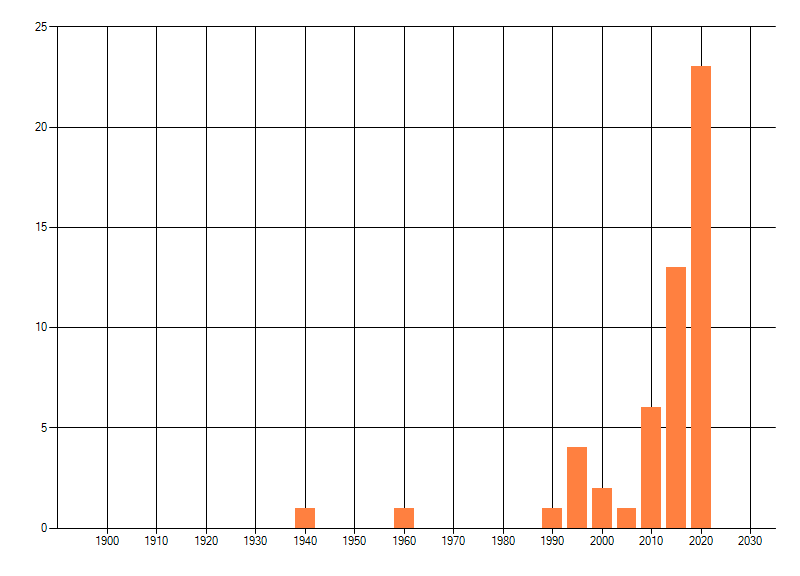 Het aantal atlasblokken (5x5 km) waarin de soort is gemeld binnen een periode van vijf jaar (vanaf 1980) of twintig jaar. Niet gecorrigeerd voor waarnemersinspanning en het aantal doorgegeven waarnemingen kan sterk variëren per periode, dus een trend in verspreiding kan hier niet direct uit worden afgelezen. Het opgegeven jaartal is het eerste jaar van de periode. Bron: gevalideerde waarnemingen uit de NDFF.