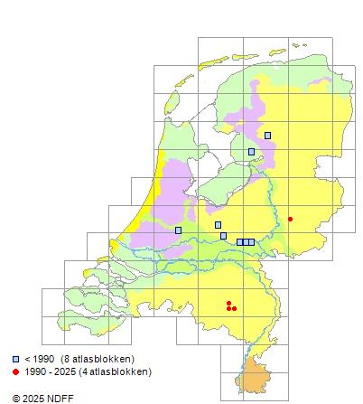 Het aantal atlasblokken (5x5 km) waarin de soort is gemeld binnen een periode van vijf jaar (vanaf 1980) of twintig jaar. Niet gecorrigeerd voor waarnemersinspanning en het aantal doorgegeven waarnemingen kan sterk variëren per periode, dus een trend in verspreiding kan hier niet direct uit worden afgelezen. Het opgegeven jaartal is het eerste jaar van de periode. Bron: gevalideerde waarnemingen uit de NDFF.