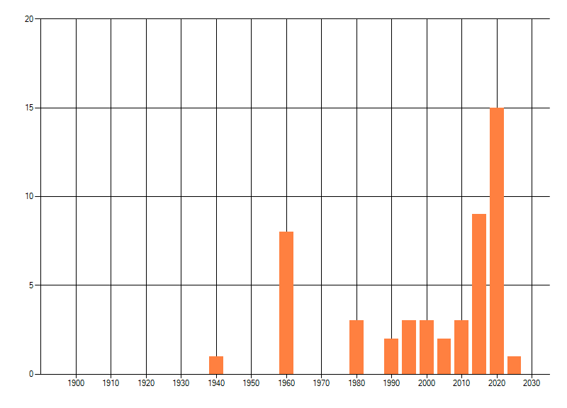 Het aantal atlasblokken (5x5 km) waarin de soort is gemeld binnen een periode van vijf jaar (vanaf 1980) of twintig jaar. Niet gecorrigeerd voor waarnemersinspanning en het aantal doorgegeven waarnemingen kan sterk variëren per periode, dus een trend in verspreiding kan hier niet direct uit worden afgelezen. Het opgegeven jaartal is het eerste jaar van de periode. Bron: gevalideerde waarnemingen uit de NDFF.