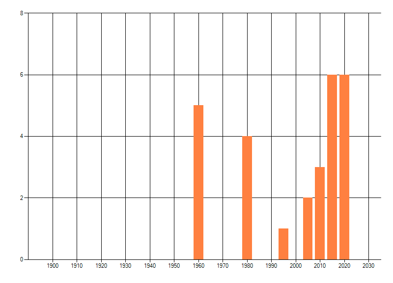 Het aantal atlasblokken (5x5 km) waarin de soort is gemeld binnen een periode van vijf jaar (vanaf 1980) of twintig jaar. Niet gecorrigeerd voor waarnemersinspanning en het aantal doorgegeven waarnemingen kan sterk variëren per periode, dus een trend in verspreiding kan hier niet direct uit worden afgelezen. Het opgegeven jaartal is het eerste jaar van de periode. Bron: gevalideerde waarnemingen uit de NDFF.