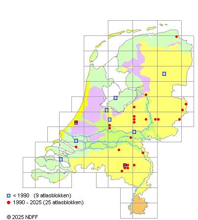Het aantal atlasblokken (5x5 km) waarin de soort is gemeld binnen een periode van vijf jaar (vanaf 1980) of twintig jaar. Niet gecorrigeerd voor waarnemersinspanning en het aantal doorgegeven waarnemingen kan sterk variëren per periode, dus een trend in verspreiding kan hier niet direct uit worden afgelezen. Het opgegeven jaartal is het eerste jaar van de periode. Bron: gevalideerde waarnemingen uit de NDFF.