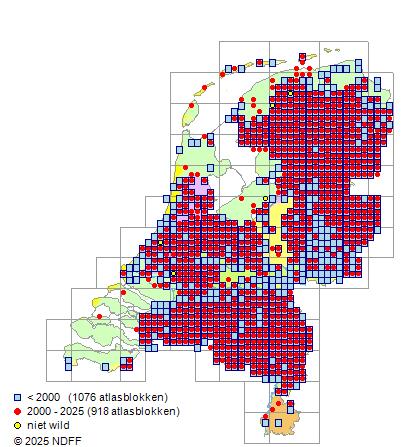 CC BY-NC-SA 3.0 NLVerspreidingNederlandVrij algemeen in het oosten en midden van het land, in laagveengebieden en in de Zuid-Hollandse duinen en zeldzaam in het rivierengebied. Elders zeer zeldzaam. Niet op de Zeeuwse (schier-)eilanden.