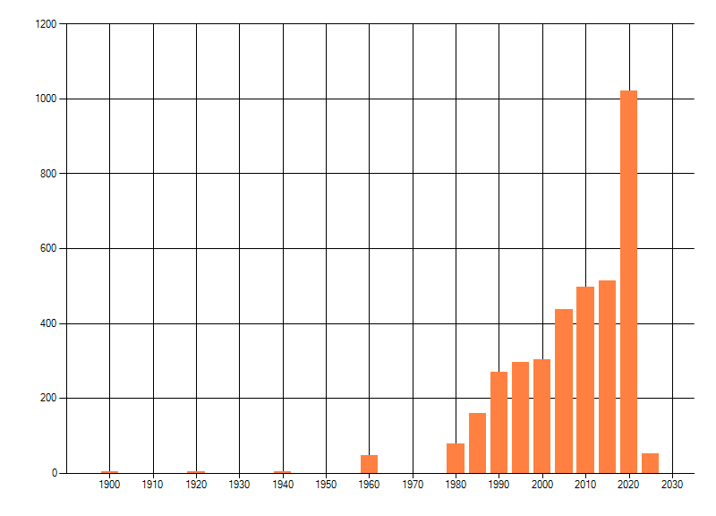Het aantal atlasblokken (5x5 km) waarin de soort is gemeld binnen een periode van vijf jaar (vanaf 1980) of twintig jaar. Niet gecorrigeerd voor waarnemersinspanning en het aantal doorgegeven waarnemingen kan sterk variëren per periode, dus een trend in verspreiding kan hier niet direct uit worden afgelezen. Het opgegeven jaartal is het eerste jaar van de periode. Bron: gevalideerde waarnemingen uit de NDFF.