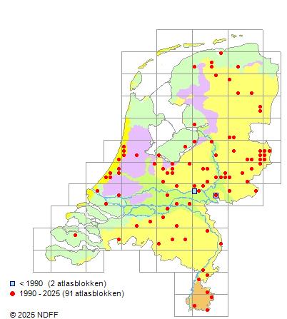Het aantal atlasblokken (5x5 km) waarin de soort is gemeld binnen een periode van vijf jaar (vanaf 1980) of twintig jaar. Niet gecorrigeerd voor waarnemersinspanning en het aantal doorgegeven waarnemingen kan sterk variëren per periode, dus een trend in verspreiding kan hier niet direct uit worden afgelezen. Het opgegeven jaartal is het eerste jaar van de periode. Bron: gevalideerde waarnemingen uit de NDFF.