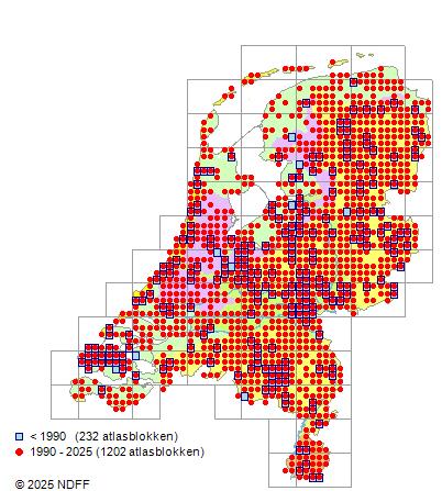 Het aantal atlasblokken (5x5 km) waarin de soort is gemeld binnen een periode van vijf jaar (vanaf 1980) of twintig jaar. Niet gecorrigeerd voor waarnemersinspanning en het aantal doorgegeven waarnemingen kan sterk variëren per periode, dus een trend in verspreiding kan hier niet direct uit worden afgelezen. Het opgegeven jaartal is het eerste jaar van de periode. Bron: gevalideerde waarnemingen uit de NDFF.