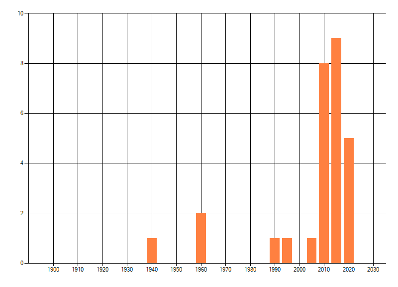 Het aantal atlasblokken (5x5 km) waarin de soort is gemeld binnen een periode van vijf jaar (vanaf 1980) of twintig jaar. Niet gecorrigeerd voor waarnemersinspanning en het aantal doorgegeven waarnemingen kan sterk variëren per periode, dus een trend in verspreiding kan hier niet direct uit worden afgelezen. Het opgegeven jaartal is het eerste jaar van de periode. Bron: gevalideerde waarnemingen uit de NDFF.