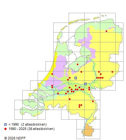 Het aantal atlasblokken (5x5 km) waarin de soort is gemeld binnen een periode van vijf jaar (vanaf 1980) of twintig jaar. Niet gecorrigeerd voor waarnemersinspanning en het aantal doorgegeven waarnemingen kan sterk variëren per periode, dus een trend in verspreiding kan hier niet direct uit worden afgelezen. Het opgegeven jaartal is het eerste jaar van de periode. Bron: gevalideerde waarnemingen uit de NDFF.