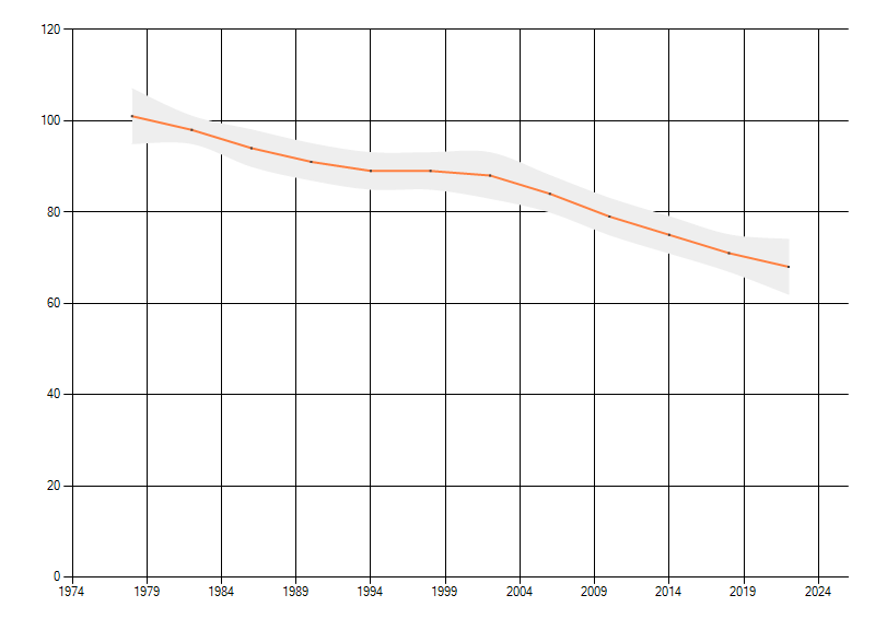 Gemiddelde trend van het aantal kilometerhokken waarin de soort voorkomt, weergegeven als indexcijfer (1975-1978 = 100). De trend is gecorrigeerd voor waarnemersinspanning en geeft de relatieve verandering in het aantal bezette kilometerhokken weer. Voor de berekening worden de data per periode van vier jaar samengenomen. In de grafiek correspondeert ieder punt met het laatste jaar van zo'n periode.