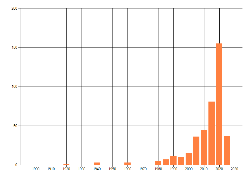 Het aantal atlasblokken (5x5 km) waarin de soort is gemeld binnen een periode van vijf jaar (vanaf 1980) of twintig jaar. Niet gecorrigeerd voor waarnemersinspanning en het aantal doorgegeven waarnemingen kan sterk variëren per periode, dus een trend in verspreiding kan hier niet direct uit worden afgelezen. Het opgegeven jaartal is het eerste jaar van de periode. Bron: gevalideerde waarnemingen uit de NDFF.