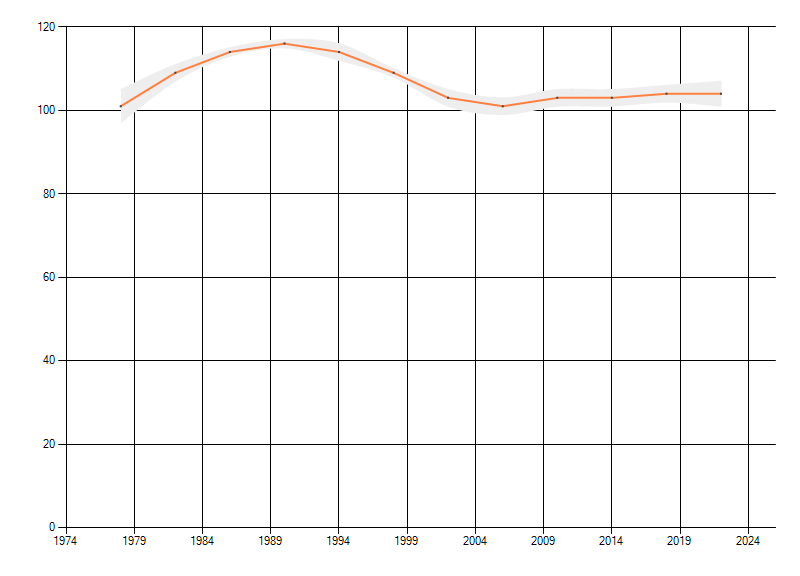 Gemiddelde trend van het aantal kilometerhokken waarin de soort voorkomt, weergegeven als indexcijfer (1975-1978 = 100). De trend is gecorrigeerd voor waarnemersinspanning en geeft de relatieve verandering in het aantal bezette kilometerhokken weer. Voor de berekening worden de data per periode van vier jaar samengenomen. In de grafiek correspondeert ieder punt met het laatste jaar van zo'n periode.