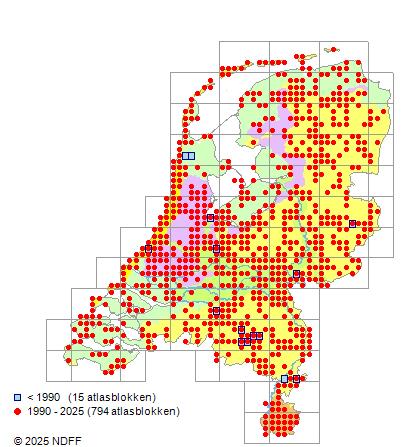 Het aantal atlasblokken (5x5 km) waarin de soort is gemeld binnen een periode van vijf jaar (vanaf 1980) of twintig jaar. Niet gecorrigeerd voor waarnemersinspanning en het aantal doorgegeven waarnemingen kan sterk variëren per periode, dus een trend in verspreiding kan hier niet direct uit worden afgelezen. Het opgegeven jaartal is het eerste jaar van de periode. Bron: gevalideerde waarnemingen uit de NDFF.
