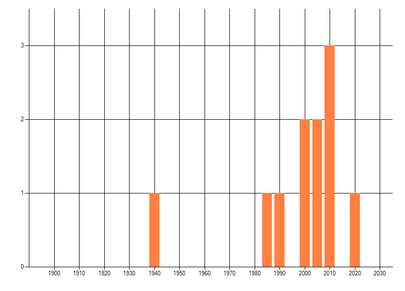 Het aantal atlasblokken (5x5 km) waarin de soort is gemeld binnen een periode van vijf jaar (vanaf 1980) of twintig jaar. Niet gecorrigeerd voor waarnemersinspanning en het aantal doorgegeven waarnemingen kan sterk variëren per periode, dus een trend in verspreiding kan hier niet direct uit worden afgelezen. Het opgegeven jaartal is het eerste jaar van de periode. Bron: gevalideerde waarnemingen uit de NDFF.