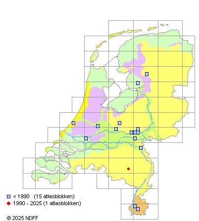 Het aantal atlasblokken (5x5 km) waarin de soort is gemeld binnen een periode van vijf jaar (vanaf 1980) of twintig jaar. Niet gecorrigeerd voor waarnemersinspanning en het aantal doorgegeven waarnemingen kan sterk variëren per periode, dus een trend in verspreiding kan hier niet direct uit worden afgelezen. Het opgegeven jaartal is het eerste jaar van de periode. Bron: gevalideerde waarnemingen uit de NDFF.