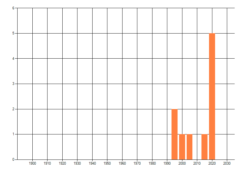 Het aantal atlasblokken (5x5 km) waarin de soort is gemeld binnen een periode van vijf jaar (vanaf 1980) of twintig jaar. Niet gecorrigeerd voor waarnemersinspanning en het aantal doorgegeven waarnemingen kan sterk variëren per periode, dus een trend in verspreiding kan hier niet direct uit worden afgelezen. Het opgegeven jaartal is het eerste jaar van de periode. Bron: gevalideerde waarnemingen uit de NDFF.