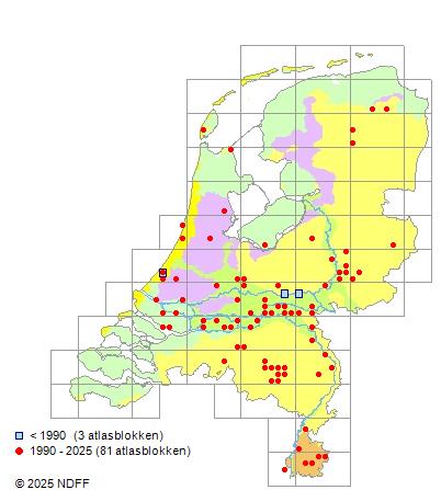 Het aantal atlasblokken (5x5 km) waarin de soort is gemeld binnen een periode van vijf jaar (vanaf 1980) of twintig jaar. Niet gecorrigeerd voor waarnemersinspanning en het aantal doorgegeven waarnemingen kan sterk variëren per periode, dus een trend in verspreiding kan hier niet direct uit worden afgelezen. Het opgegeven jaartal is het eerste jaar van de periode. Bron: gevalideerde waarnemingen uit de NDFF.