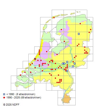 Het aantal atlasblokken (5x5 km) waarin de soort is gemeld binnen een periode van vijf jaar (vanaf 1980) of twintig jaar. Niet gecorrigeerd voor waarnemersinspanning en het aantal doorgegeven waarnemingen kan sterk variëren per periode, dus een trend in verspreiding kan hier niet direct uit worden afgelezen. Het opgegeven jaartal is het eerste jaar van de periode. Bron: gevalideerde waarnemingen uit de NDFF.