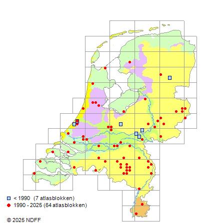 Het aantal atlasblokken (5x5 km) waarin de soort is gemeld binnen een periode van vijf jaar (vanaf 1980) of twintig jaar. Niet gecorrigeerd voor waarnemersinspanning en het aantal doorgegeven waarnemingen kan sterk variëren per periode, dus een trend in verspreiding kan hier niet direct uit worden afgelezen. Het opgegeven jaartal is het eerste jaar van de periode. Bron: gevalideerde waarnemingen uit de NDFF.