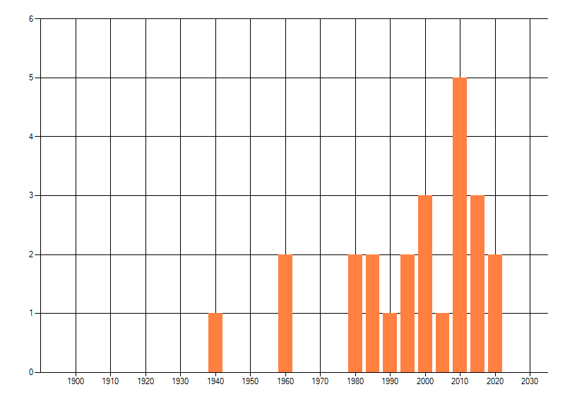 Het aantal atlasblokken (5x5 km) waarin de soort is gemeld binnen een periode van vijf jaar (vanaf 1980) of twintig jaar. Niet gecorrigeerd voor waarnemersinspanning en het aantal doorgegeven waarnemingen kan sterk variëren per periode, dus een trend in verspreiding kan hier niet direct uit worden afgelezen. Het opgegeven jaartal is het eerste jaar van de periode. Bron: gevalideerde waarnemingen uit de NDFF.
