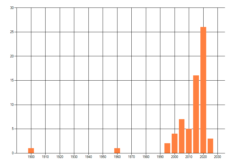 Het aantal atlasblokken (5x5 km) waarin de soort is gemeld binnen een periode van vijf jaar (vanaf 1980) of twintig jaar. Niet gecorrigeerd voor waarnemersinspanning en het aantal doorgegeven waarnemingen kan sterk variëren per periode, dus een trend in verspreiding kan hier niet direct uit worden afgelezen. Het opgegeven jaartal is het eerste jaar van de periode. Bron: gevalideerde waarnemingen uit de NDFF.