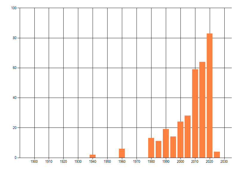 Het aantal atlasblokken (5x5 km) waarin de soort is gemeld binnen een periode van vijf jaar (vanaf 1980) of twintig jaar. Niet gecorrigeerd voor waarnemersinspanning en het aantal doorgegeven waarnemingen kan sterk variëren per periode, dus een trend in verspreiding kan hier niet direct uit worden afgelezen. Het opgegeven jaartal is het eerste jaar van de periode. Bron: gevalideerde waarnemingen uit de NDFF.