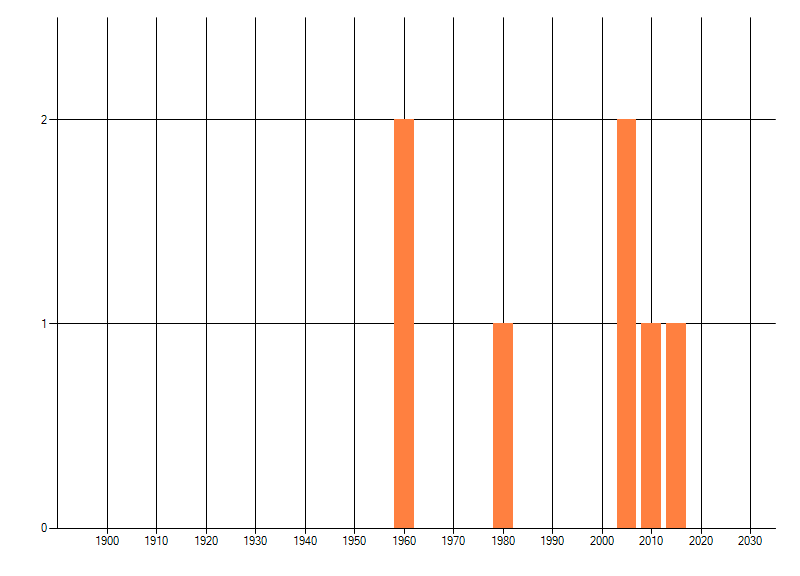 Het aantal atlasblokken (5x5 km) waarin de soort is gemeld binnen een periode van vijf jaar (vanaf 1980) of twintig jaar. Niet gecorrigeerd voor waarnemersinspanning en het aantal doorgegeven waarnemingen kan sterk variëren per periode, dus een trend in verspreiding kan hier niet direct uit worden afgelezen. Het opgegeven jaartal is het eerste jaar van de periode. Bron: gevalideerde waarnemingen uit de NDFF.
