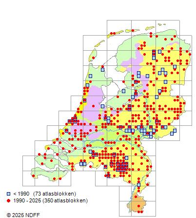 Het aantal atlasblokken (5x5 km) waarin de soort is gemeld binnen een periode van vijf jaar (vanaf 1980) of twintig jaar. Niet gecorrigeerd voor waarnemersinspanning en het aantal doorgegeven waarnemingen kan sterk variëren per periode, dus een trend in verspreiding kan hier niet direct uit worden afgelezen. Het opgegeven jaartal is het eerste jaar van de periode. Bron: gevalideerde waarnemingen uit de NDFF.
