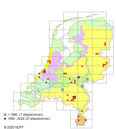 Het aantal atlasblokken (5x5 km) waarin de soort is gemeld binnen een periode van vijf jaar (vanaf 1980) of twintig jaar. Niet gecorrigeerd voor waarnemersinspanning en het aantal doorgegeven waarnemingen kan sterk variëren per periode, dus een trend in verspreiding kan hier niet direct uit worden afgelezen. Het opgegeven jaartal is het eerste jaar van de periode. Bron: gevalideerde waarnemingen uit de NDFF.