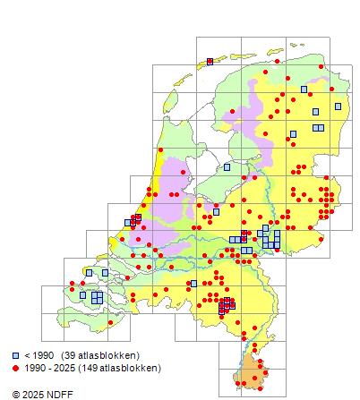 Het aantal atlasblokken (5x5 km) waarin de soort is gemeld binnen een periode van vijf jaar (vanaf 1980) of twintig jaar. Niet gecorrigeerd voor waarnemersinspanning en het aantal doorgegeven waarnemingen kan sterk variëren per periode, dus een trend in verspreiding kan hier niet direct uit worden afgelezen. Het opgegeven jaartal is het eerste jaar van de periode. Bron: gevalideerde waarnemingen uit de NDFF.