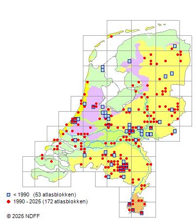 Het aantal atlasblokken (5x5 km) waarin de soort is gemeld binnen een periode van vijf jaar (vanaf 1980) of twintig jaar. Niet gecorrigeerd voor waarnemersinspanning en het aantal doorgegeven waarnemingen kan sterk variëren per periode, dus een trend in verspreiding kan hier niet direct uit worden afgelezen. Het opgegeven jaartal is het eerste jaar van de periode. Bron: gevalideerde waarnemingen uit de NDFF.