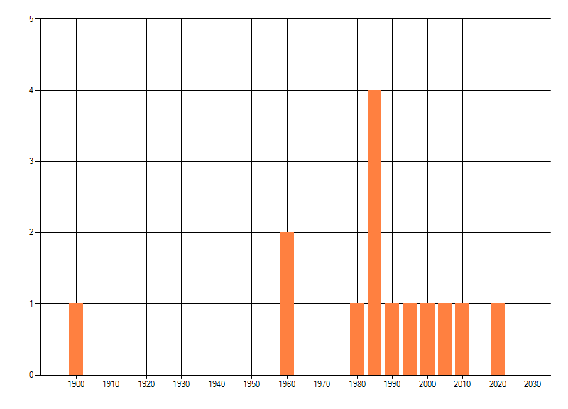 Het aantal atlasblokken (5x5 km) waarin de soort is gemeld binnen een periode van vijf jaar (vanaf 1980) of twintig jaar. Niet gecorrigeerd voor waarnemersinspanning en het aantal doorgegeven waarnemingen kan sterk variëren per periode, dus een trend in verspreiding kan hier niet direct uit worden afgelezen. Het opgegeven jaartal is het eerste jaar van de periode. Bron: gevalideerde waarnemingen uit de NDFF.