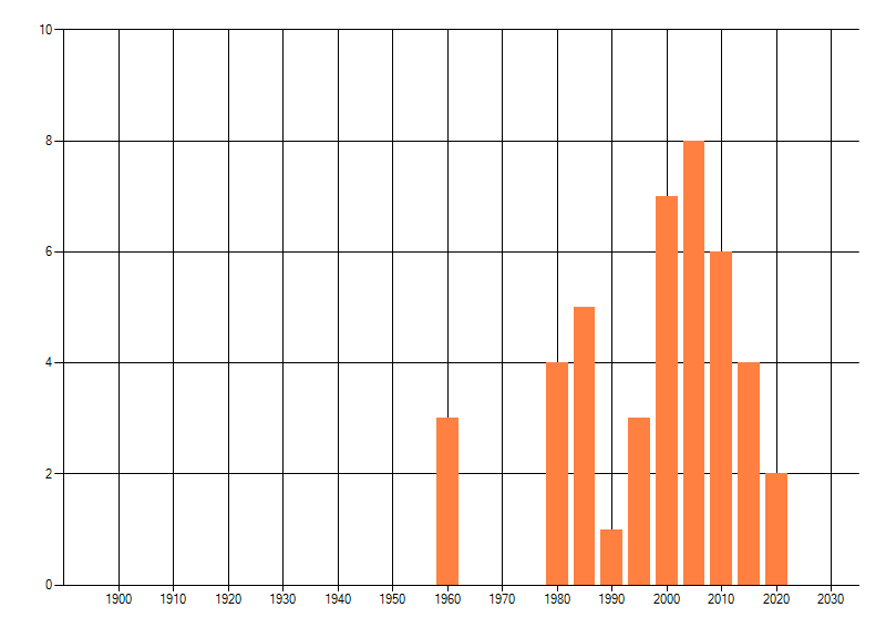 Het aantal atlasblokken (5x5 km) waarin de soort is gemeld binnen een periode van vijf jaar (vanaf 1980) of twintig jaar. Niet gecorrigeerd voor waarnemersinspanning en het aantal doorgegeven waarnemingen kan sterk variëren per periode, dus een trend in verspreiding kan hier niet direct uit worden afgelezen. Het opgegeven jaartal is het eerste jaar van de periode. Bron: gevalideerde waarnemingen uit de NDFF.