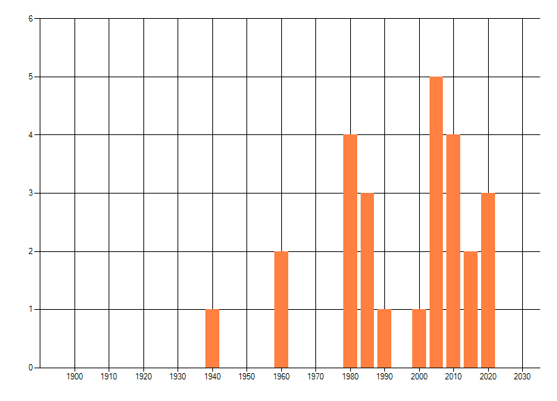 Het aantal atlasblokken (5x5 km) waarin de soort is gemeld binnen een periode van vijf jaar (vanaf 1980) of twintig jaar. Niet gecorrigeerd voor waarnemersinspanning en het aantal doorgegeven waarnemingen kan sterk variëren per periode, dus een trend in verspreiding kan hier niet direct uit worden afgelezen. Het opgegeven jaartal is het eerste jaar van de periode. Bron: gevalideerde waarnemingen uit de NDFF.