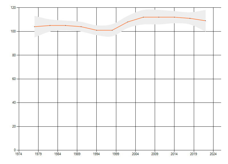 Gemiddelde trend van het aantal kilometerhokken waarin de soort voorkomt, weergegeven als indexcijfer (1975-1978 = 100). De trend is gecorrigeerd voor waarnemersinspanning en geeft de relatieve verandering in het aantal bezette kilometerhokken weer. Voor de berekening worden de data per periode van vier jaar samengenomen. In de grafiek correspondeert ieder punt met het laatste jaar van zo'n periode.