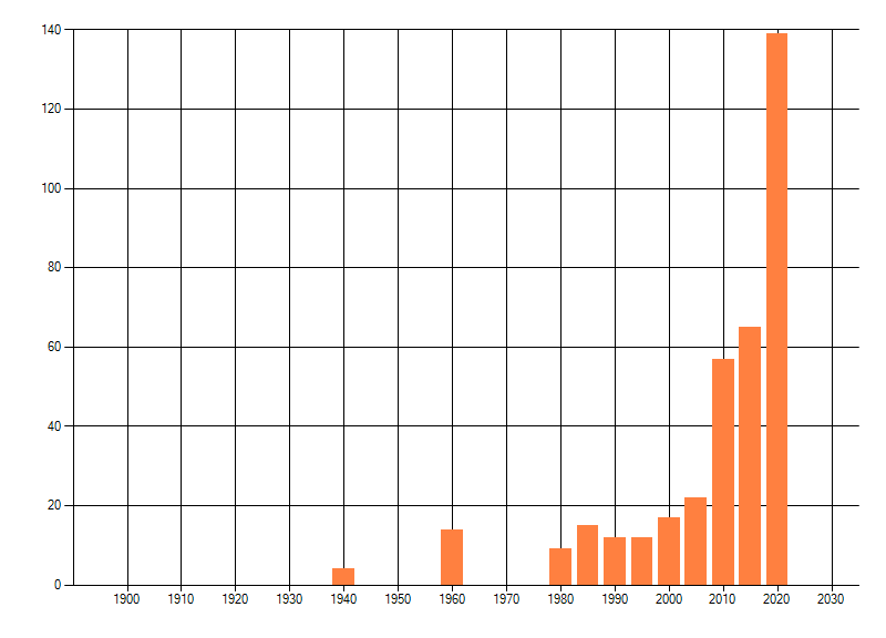 Het aantal atlasblokken (5x5 km) waarin de soort is gemeld binnen een periode van vijf jaar (vanaf 1980) of twintig jaar. Niet gecorrigeerd voor waarnemersinspanning en het aantal doorgegeven waarnemingen kan sterk variëren per periode, dus een trend in verspreiding kan hier niet direct uit worden afgelezen. Het opgegeven jaartal is het eerste jaar van de periode. Bron: gevalideerde waarnemingen uit de NDFF.