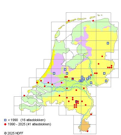 Het aantal atlasblokken (5x5 km) waarin de soort is gemeld binnen een periode van vijf jaar (vanaf 1980) of twintig jaar. Niet gecorrigeerd voor waarnemersinspanning en het aantal doorgegeven waarnemingen kan sterk variëren per periode, dus een trend in verspreiding kan hier niet direct uit worden afgelezen. Het opgegeven jaartal is het eerste jaar van de periode. Bron: gevalideerde waarnemingen uit de NDFF.